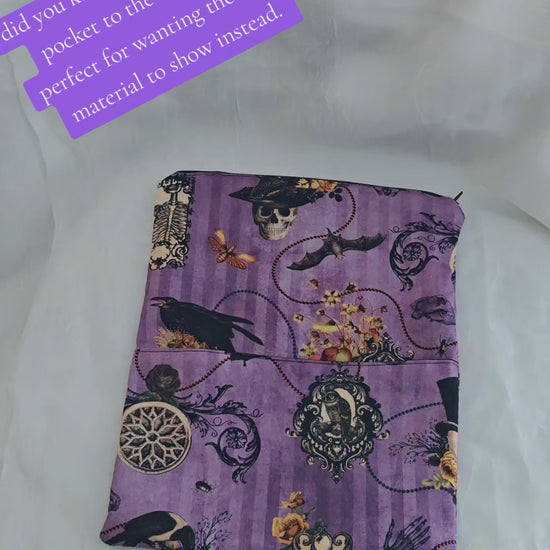 Whether you just want something for spooky season or something spooky year round, this book sleeve is just for you. Purple vertical subtle stripes are the background to skeletons, bats, and other spooky imagery.